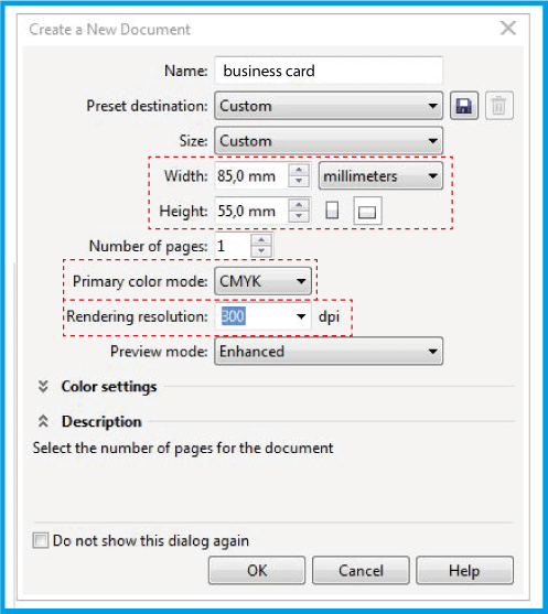 1.2 .In this window, define the name and dimensions of the document. Select the CMYK field Primary color mode and in Rendering resolution enter 300 dpi .